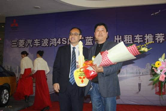 三菱4S店總經(jīng)理劉總與綿陽(yáng)市區(qū)首臺(tái)藍(lán)瑟出租車(chē)用戶(hù)斯先生合影