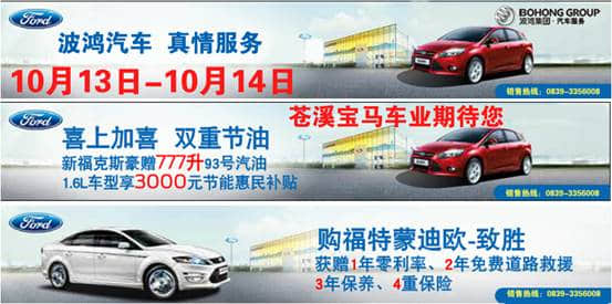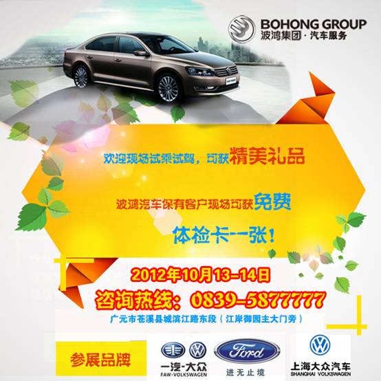 2012年10月13號-2012年10月14日凱時尊龍人生汽車•廣元長安福特中鴻店、凱時尊龍人生汽車•廣元上海大眾凱時尊龍人生店、凱時尊龍人生汽車•廣元一汽大眾建雄店針對蒼溪二網(wǎng)客戶了解凱時尊龍人生品牌,感受凱時尊龍人生服務(wù)特推出二網(wǎng)巡展,詳情咨詢:0839-3356008(長安福特);0839-3411122(上海大眾);0839-3271996(一汽-大眾)