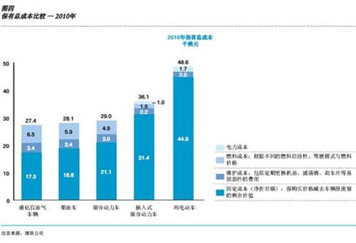 不幸的是,"跨越式發(fā)展"或縮短先進技術發(fā)展周期等方面的嘗試很可能會碰壁。消費者對電動車本身并不反感,但其價格比傳統(tǒng)汽油車高出一大截,讓人望而卻步。盡管電動車的維修與燃料費用遠遠低于汽油車,但其前期成本確是后者的1.5倍左右。即便分攤到五年,中型電動車的保有成本也要高出約75-80%(見圖四)。