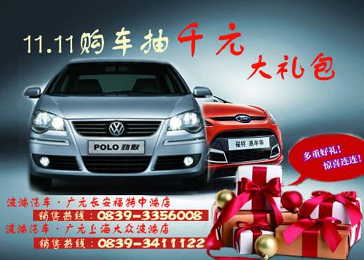 更多優(yōu)惠政策歡迎咨詢:0839-3411122.更重要的是,光棍節(jié)這天不管您是否已經(jīng)購車,是否計(jì)劃購車,都要來廣元上海大眾4S店看看,相信您絕對不虛此行!