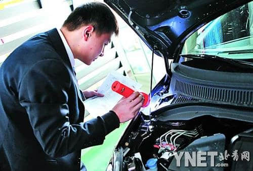 上午九點(diǎn)半,李先生在店內(nèi)填寫完相關(guān)購(gòu)車資料后,就開始了驗(yàn)車上牌的第一個(gè)環(huán)節(jié)。李先生按要求把換購(gòu)的雨燕開到4S店內(nèi)的檢測(cè)地,外檢員按規(guī)定依次現(xiàn)場(chǎng)檢驗(yàn)了汽車的車架號(hào)、發(fā)動(dòng)機(jī)號(hào)、輪胎規(guī)格,并按照合格證上的信息核對(duì)生產(chǎn)日期,查看滅火器和三角牌是否放置到位,一切檢查無(wú)誤后填寫單據(jù),整個(gè)過(guò)程用時(shí)約5分鐘。