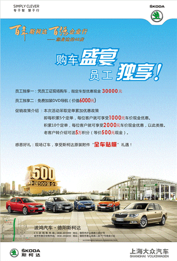 斯柯達(dá)為百?gòu)?qiáng)企業(yè)員工提供“百?gòu)?qiáng)員工專(zhuān)項(xiàng)購(gòu)車(chē)優(yōu)惠”,優(yōu)惠時(shí)間不限,只要是百?gòu)?qiáng)企業(yè)員工,出具工作證明,就能享受該項(xiàng)優(yōu)惠。