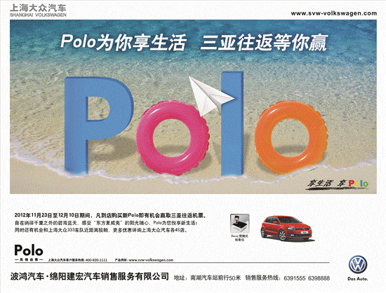 POLO十年,親情回饋,上海大眾為感謝新老顧客對(duì)POLO車的親睞,特別在2012年11月23日至2012年12月10日期間,購(gòu)買POLO的客戶,就有機(jī)會(huì)贏雙飛三亞,POLO為您贏取悠閑生活!