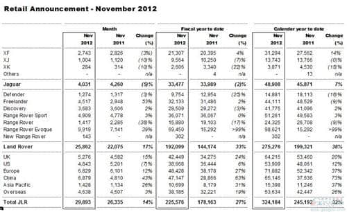 1到11月份,捷豹路虎全球累計銷量為324,184輛,在2011年同期245,192輛的基礎(chǔ)上,同比提高32.2%。按照母公司塔塔集團財年(本財年2012年4月1日至2013年3月31日)計算,本財年累計銷量(4至11月)225,576輛,較上財年同期的178,163輛同比增長26.6%。今年4至11月份銷量增長速度較前11個月平均水平有所放緩。