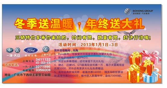 2013年1月1號-2013年1月3號凱時尊龍人生汽車•廣元上海大眾凱時尊龍人生旗艦店在國際會展中心舉辦“迎新春,送溫暖”元旦大型車展暨廣元市民我最喜愛車型活動,上海大眾全系車輛傾情鉅獻:購Polo系列,享受0利息,萬元現(xiàn)金優(yōu)惠,還有關愛大禮包;購新帕薩特系列,送IPAD3;全新桑塔納全面接受預定,還可享受千元大禮包 ,購車一切盡在凱時尊龍人生汽車-廣元上海大眾凱時尊龍人生4S店。