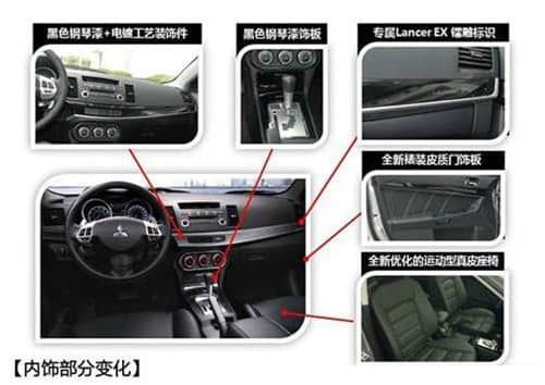 車內(nèi)部分的變化乍看之下與老款車型無異,高配車型繼續(xù)采用炫酷黑色內(nèi)飾,并且加入了大量鋼琴烤漆和電鍍工藝飾條。車門飾板的裱裝皮質(zhì)和之前有所不同,中控臺(tái)飾條的右側(cè)新增了Lancer EX專屬鐳射標(biāo)識(shí)。