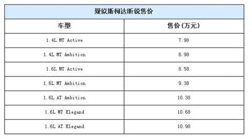斯柯達昕銳售價曝光 或售7.98-10.98萬