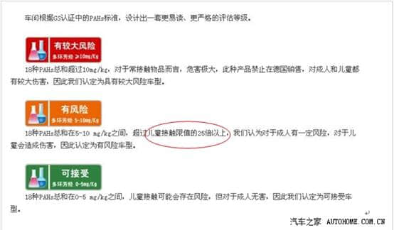 車問網(wǎng)自行設(shè)計了評價標(biāo)準(zhǔn),其中對于有風(fēng)險車型的要求是沒有理論依據(jù)的,完全是車問網(wǎng)人為主觀的判斷。車問網(wǎng)認(rèn)為有風(fēng)險的評價標(biāo)準(zhǔn)是18項PAHs總和在5-10mg/kg,超過兒童接觸限值(第一類產(chǎn)品0.2mg/kg)的25倍,是不負(fù)責(zé)任的推斷,沒讀懂標(biāo)準(zhǔn)就出報告,這不是誤導(dǎo)我們嗎,當(dāng)我們一樣白癡,評價的第二類產(chǎn)品,按第一類產(chǎn)品的標(biāo)準(zhǔn)進(jìn)行人為臆斷,顯然是嚴(yán)重不符合邏輯的。