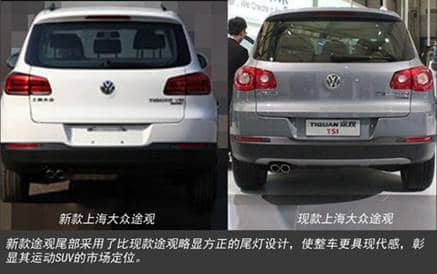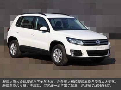 2012款上海大眾途觀市已有1年多的時間,其在擁有良好銷量的同時,也接近了改款周期。近日網(wǎng)通社從上海大眾經(jīng)銷商處獲悉:改款途觀將于今年下半年上市,新車對外觀進行了小幅調整,車身長度有所減小,而配置則有了進一步提升,并新增了LED前大燈。