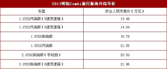據(jù)德國(guó)媒體報(bào)道,斯柯達(dá)旗下明銳Combi旅行版車(chē)型正式上市,其新車(chē)推出了三個(gè)排量共計(jì)6款車(chē)型。新車(chē)折合人民幣售價(jià)區(qū)間為13.46-21.96萬(wàn)元。具體售價(jià)詳見(jiàn)下表: