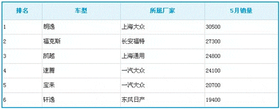 2013年5月A級車銷量排行榜前六(中汽協(xié)數(shù)據(jù))