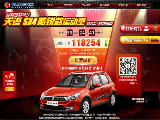 天語SX4酷銳款微賣場搶購活動采取轉(zhuǎn)播降價(jià)的形式,參與活動的網(wǎng)友,只要點(diǎn)擊活動首頁“我要喊價(jià)”,轉(zhuǎn)播活動信息一次,官方售價(jià)118800元的天語SX4酷銳款運(yùn)動型新車立降1元,轉(zhuǎn)發(fā)人數(shù)越多,新車售價(jià)越低,終極抄底最高優(yōu)惠2萬元,至4S店還可同時(shí)享受本月“天語 SX4 鉅惠風(fēng)暴 最高優(yōu)惠2萬元”活動政策,累計(jì)最高優(yōu)惠接近4萬元?;顒娱_始后隨時(shí)可秒殺商品,第1位拍下并成功支付定金的用戶將可獲得優(yōu)惠購車資格。數(shù)量有限,先搶先得!另外還有注冊有禮、微信互動,多重活動禮上加禮,精美禮品iPadmini超值大獎等你拿,還等什么,趕快參與吧! http://e.t.qq.com/changansuzuki?tab=minisite