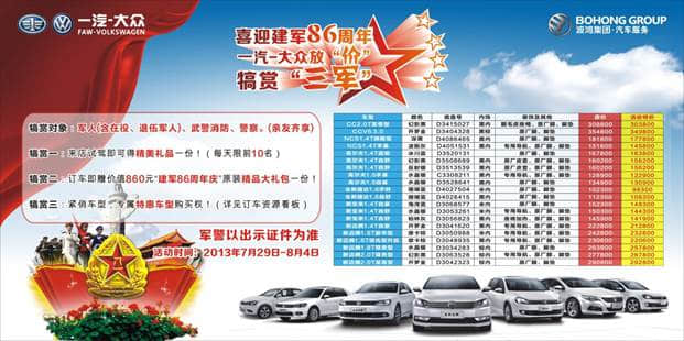 2013年8月1日為我國建軍86周年,為慶祝這一盛大的節(jié)日,凱時(shí)尊龍人生汽車.綿陽一汽-大眾倍爾店特犒賞“三軍 ”,放“價(jià)”一周!