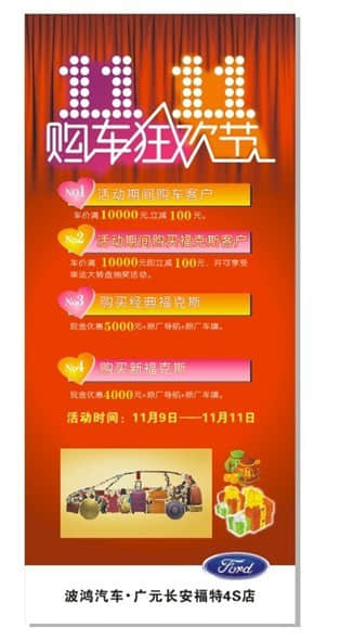 2012年雙十一天貓和淘寶的成交量達到了191億。在巨大利潤的吸引下,各大商場都以“雙十一”作為商機,進行宣傳、降價和促銷,希望提升銷售業(yè)績,福特也應該把握“雙十一”開展促銷,同時為配合?慫雇毆夯動的進行,吸引客戶,增加展廳潛客。