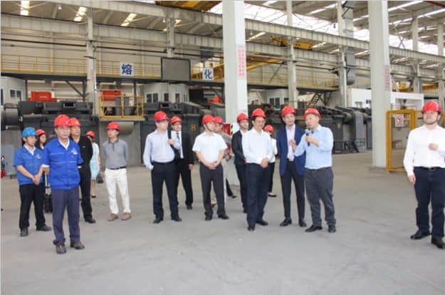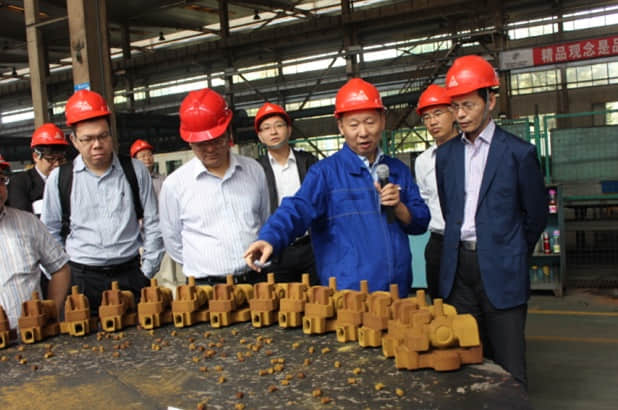 在鑄造一分廠生產(chǎn)車間,萬總引領(lǐng)王主任、劉常委一行參觀了丹麥DISA造型生產(chǎn)線和日本新東造型生產(chǎn)線。在鑄造二分廠,萬總重點(diǎn)介紹了擁有全球最好裝備設(shè)備、單體面積達(dá)到5.4萬平米全球最大的單一鑄造車間。配備了當(dāng)今國際領(lǐng)先的美國應(yīng)達(dá)中頻感應(yīng)熔煉系統(tǒng)、德國KW水平有箱多觸頭靜壓造型線、德國HWS水平有箱多觸頭靜壓造型線。