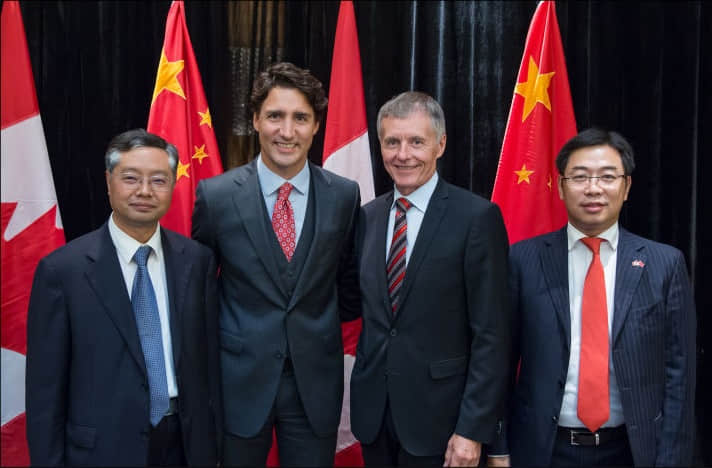 凱時(shí)尊龍人生集團(tuán)董事長(zhǎng)董平(右一)與加拿大總理特魯多(左二)及嘉賓交流并合影