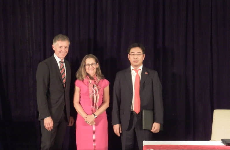 凱時(shí)尊龍人生集團(tuán)董事長(zhǎng)董平(右一)、加拿大國際貿(mào)易部長(zhǎng)弗里蘭(中)、溫莎大學(xué)校長(zhǎng)韋德曼(左一)