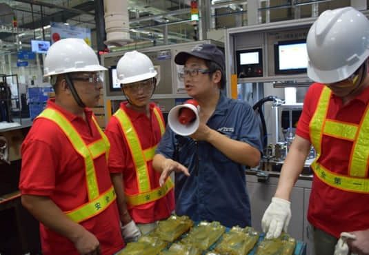 伴隨著機器隆隆聲,石慶波主管通過揚聲器向同學們逐一講解GM1.5產品機加的所有工序,從產品、終端客戶,到刀具、檢具、螺紋、氣檢、壓裝、氣密檢測、裝配、焊接以及清洗包裝。同學們仔細聆聽、頓足觀察,完全融入了現場生產氛圍;同學們興致高漲,情緒激動,對車間流水線作業(yè)不時發(fā)出感慨。部分同學還結合所學專業(yè)知識,向石主管提出了自己感興趣的問題,直到對石主管的答復完全理解后才走向下一參觀點。