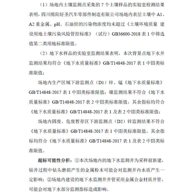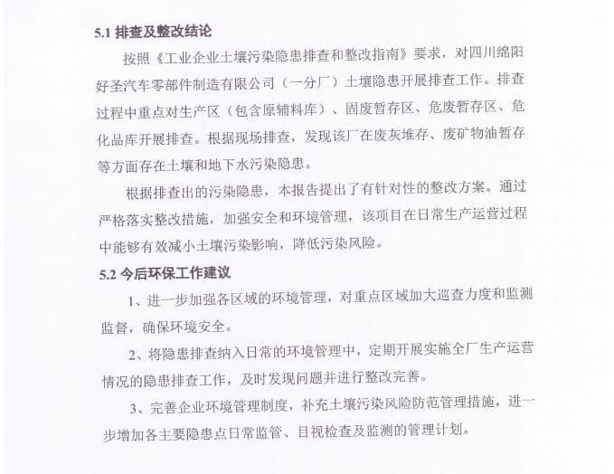 四川綿陽好圣汽車零部件制造有限公司已完成對(duì)廠區(qū)內(nèi)的土壤隱患排查整改,和土壤及地下水監(jiān)測(cè)工作,現(xiàn)將相關(guān)報(bào)告公示如下: