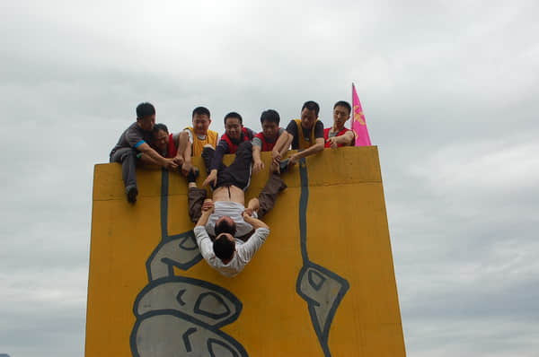 最后一個項目叫深海逃生也叫畢業(yè)墻。就是不能借助任何工具和外力,我們?nèi)w成員在最短的時間里翻越8--9米的高墻,就算全體畢業(yè)。因為時間的緊迫,我們的男隊友一個個自覺的搭成人字梯,先讓體重大,年齡大,我們女生先上,在我們共同的努力下我們以優(yōu)異的成績完成了最后一項任務(wù)(18分鐘)。當(dāng)我們?nèi)w站在畢業(yè)墻上歡呼的那一刻,看著下面的戰(zhàn)友手磨破了,肩膀也滲出了血跡,我知道了什么是勇敢,什么是奉獻,什么是大無畏精神,使我想起了一首歌是這樣唱的:“一要筷子輕輕被折斷,十根筷子牢牢抱成團”我們?yōu)槟切└蕿槿颂?,為他們的勇敢,奉獻鼓掌,感謝他們,沒有大家的共同配合,我們最終不可能完成任務(wù)!