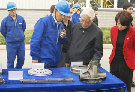 鄭老一行在六號鑄造車間外聽取了制造事業(yè)部副總宋榕輝關于好圣基本情況和發(fā)展規(guī)劃的匯報,并就好圣主要生產(chǎn)設備、產(chǎn)品做了介紹。并進入鑄造車間參觀了生產(chǎn)線工藝流程。鄭老對好圣擁有全球領先的生產(chǎn)設備感到無比欣慰,充分肯定了好圣的發(fā)展前景,并對我公司的發(fā)展規(guī)劃充滿了信心。同時有針對性的對熔煉、造型、澆注等重要生產(chǎn)環(huán)節(jié)提出了寶貴意見,指出我們不能僅擁有世界領先的生產(chǎn)設備,更要擁有屬于自己的先進生產(chǎn)技術,著重培養(yǎng)自己的人才隊伍,只有通過不斷提升自身的技術水平才能夠打出重拳、打出亮拳。