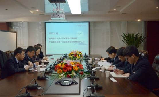 集團領(lǐng)導(dǎo)與招商銀行成都分行來訪領(lǐng)導(dǎo)在總部多媒體會議室座談