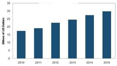 根據(jù)IHSiSuppli公司的中國研究報告,2011年中國汽車電子市場銷售額比上年增長近10%。2015年中國市場的汽車電子銷售額預(yù)計達(dá)到299億美元,如下圖所示。