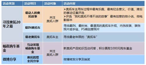 參與內(nèi)容: 經(jīng)銷商協(xié)助奧拓用戶參與活動,并負責收集新、老奧拓用戶信息,由公司將信息統(tǒng)一上傳活動專題網(wǎng)站