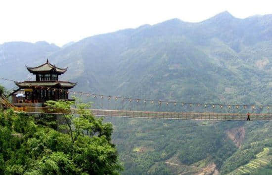 上九黃山的小路曲折蜿蜒,登上一個(gè)山坳,眼前豁然一亮:險(xiǎn)峻的山勢(shì)猶如一個(gè)圈形的座椅,扶手般對(duì)峙的兩端約相距一百多米,一道羌寨常見的吊橋飛架在兩個(gè)山嘴之間,猿王洞便座落在圈形座椅弧形的山凹處。