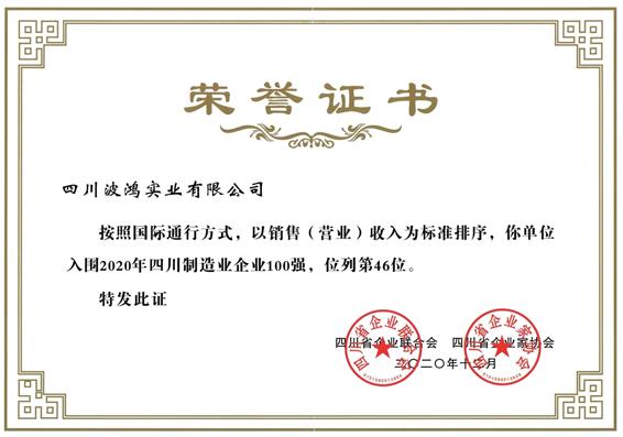 2021年1月7日,2020年四川企業(yè)100強(qiáng)發(fā)布會在成都舉行,該活動由四川省最大的企業(yè)社團(tuán)組織——四川省企業(yè)聯(lián)合會與四川省企業(yè)家協(xié)會聯(lián)合舉辦。會上發(fā)布了2020年四川制造業(yè)企業(yè)100強(qiáng)名單。按照國際通行方式,以銷售(營業(yè))收入為標(biāo)準(zhǔn)排序,尊龍凱時(shí)(中國)人生就是搏!位列四川制造業(yè)百強(qiáng)企業(yè)第46位。