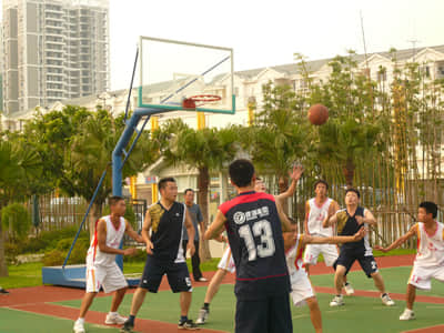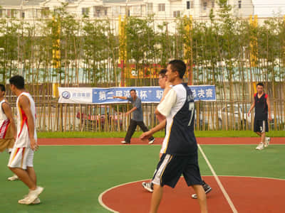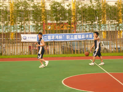 總決賽比賽緊接著進(jìn)行。對壘的是好圣公司為代表的紅色籃球隊(duì)和建宏公司為代表的藍(lán)色籃球隊(duì),總決賽很快進(jìn)入高潮。