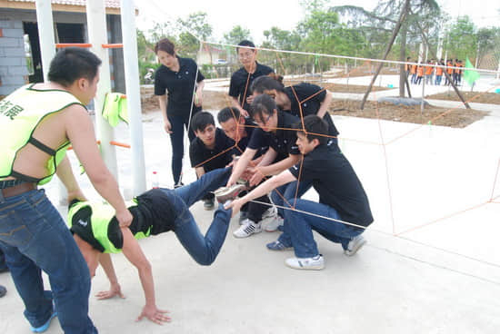 培訓(xùn)開始首先是萬年不變的“破冰”活動(dòng),會(huì)議室里,教練的幽默和大家的積極響應(yīng)讓氣氛十分歡愉融洽,彼此間很快便熟絡(luò)起來。教練把咱們被分成了兩隊(duì),一支名為“狼魂”,另一支隊(duì)伍喚作“RMB”。接著我們兩支隊(duì)伍依次體驗(yàn)了需要絕對信任的“背摔”、需要緊密合作的“穿越電網(wǎng)”、需要超越自我的“高空一躍”、需要團(tuán)隊(duì)合作的“海底逃生”等項(xiàng)目。