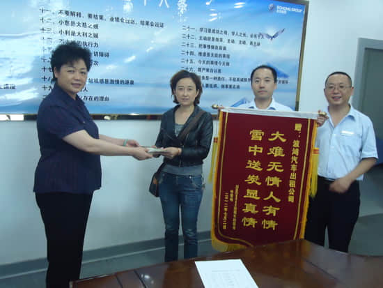 2012年7月2日,凱時(shí)尊龍人生集團(tuán)工會叱利華主席代表公司向駕駛員家屬任雪梅移交綿陽出租車行業(yè)愛心捐款。任雪梅接到叱主席遞上的捐款后,非常感動,特向凱時(shí)尊龍人生出租車公司贈送旌旗“大難無情人有情,雪中送炭顯真情”以表感謝。