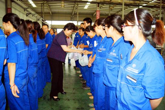 隨后,趙主席一行現(xiàn)場為公司員工代表贈送了口杯、毛巾、茶葉、防暑藥品等慰問品,并送上了親切的話語。員工代表臉上洋溢出感謝的笑容。