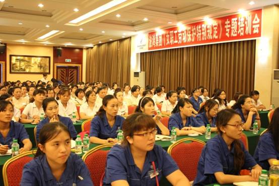 2012年8月24日下午,《女職工勞動(dòng)保護(hù)特別規(guī)定》專題培訓(xùn)會(huì)在綿陽長虹國際酒店鴻圖會(huì)議室圓滿落下帷幕。在會(huì)上,綿陽市法律援助中心主任何立群女士根據(jù)綿陽市總工會(huì)的要求及國務(wù)院第619號(hào)令頒布實(shí)施的《女職工勞動(dòng)保護(hù)特別規(guī)定》對(duì)我司的廣大女職工進(jìn)行了培訓(xùn),并結(jié)合當(dāng)代社會(huì)女職工面臨的保護(hù)熱點(diǎn)問題及我司實(shí)際情況對(duì)女職工如何保護(hù)自己的合法權(quán)益,如何去爭取自己的特殊利益等一系列問題進(jìn)行詳細(xì)、全面的講述。