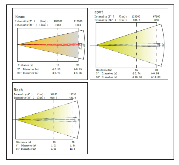 光學角度:BEAM模式:2°-25°,SPOT模式:3°-36°,WASH模式:4°-34°