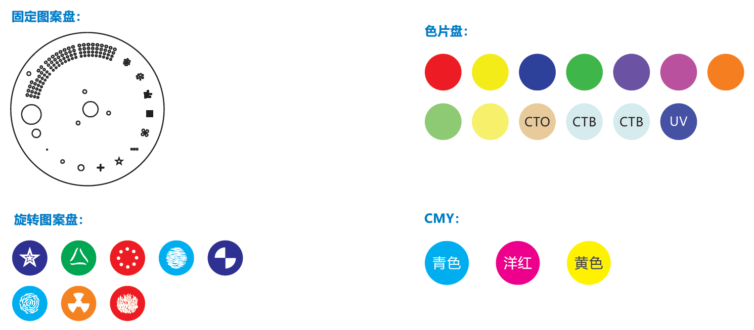 顏色盤:13個固定式色片+白光,半色效果,色片可任意定位,帶雙向旋轉的彩虹效果