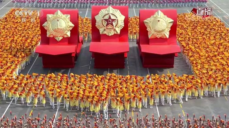 ▲以“同心共筑中國夢”為主題的群眾游行環(huán)節(jié),由10萬群眾,70組彩車組成36個方陣在長安街上鋪開了一幅壯美的盛世畫卷!