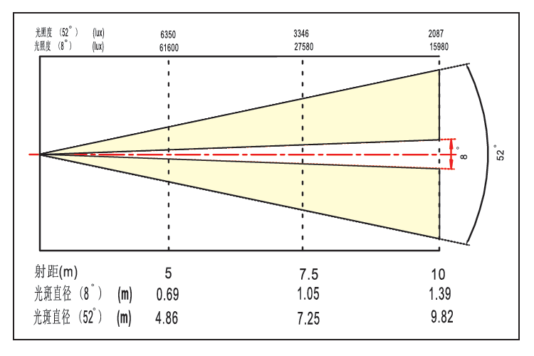 光學(xué)角度:50%光斑角度 8°-26°,100%光斑角度 15°-52°