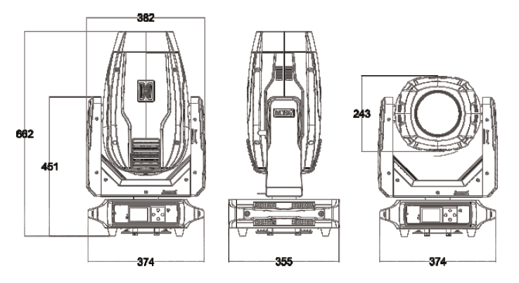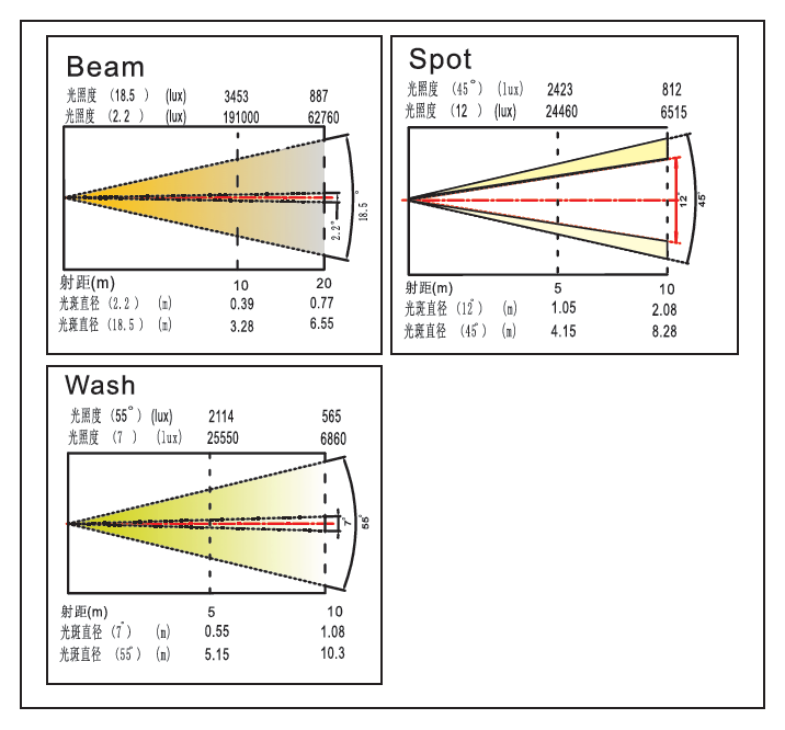 光學角度:BEAM模式:2.2°-18.5°,SPOT模式:12°-45°,WASH模式:7°-55°