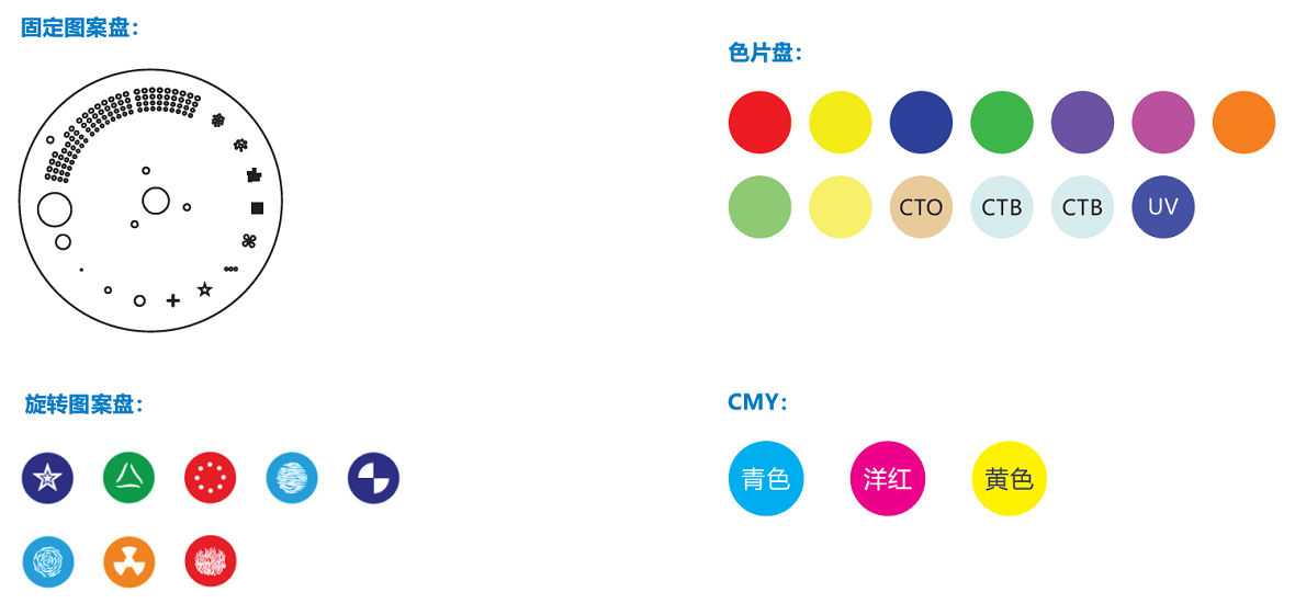顏色盤:13個固定式色片+白光,半色效果,色片可任意定位,帶雙向旋轉(zhuǎn)的彩虹效果旋轉(zhuǎn)圖案盤:8個插拔式的旋轉(zhuǎn)圖案片+白圓,帶圖案抖動和圖案任意定位功能,可實現(xiàn)自轉(zhuǎn)、流水、抖動效果