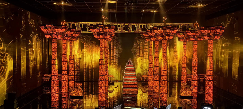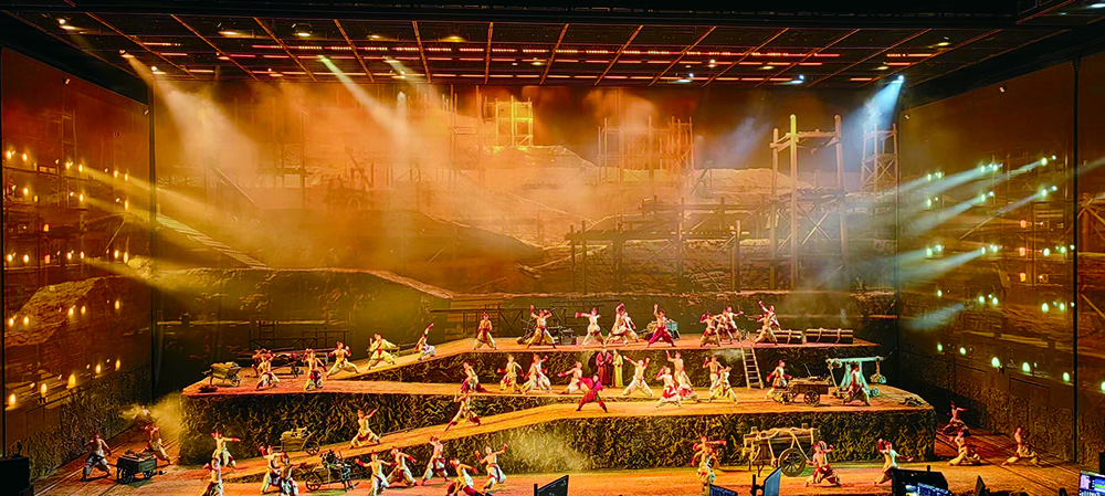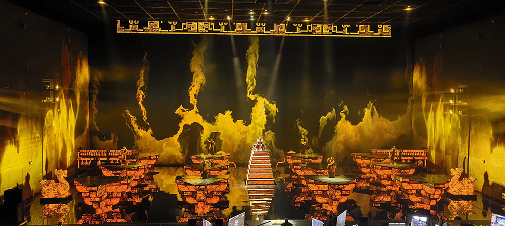 面積3.2萬平方米,1500個(gè)觀眾席位,6大演出場景,應(yīng)用突破性舞臺新技術(shù),近300套高科技舞臺機(jī)械設(shè)備,配合360度室內(nèi)實(shí)景舞美以及全息、水幕和視頻跟蹤系統(tǒng)