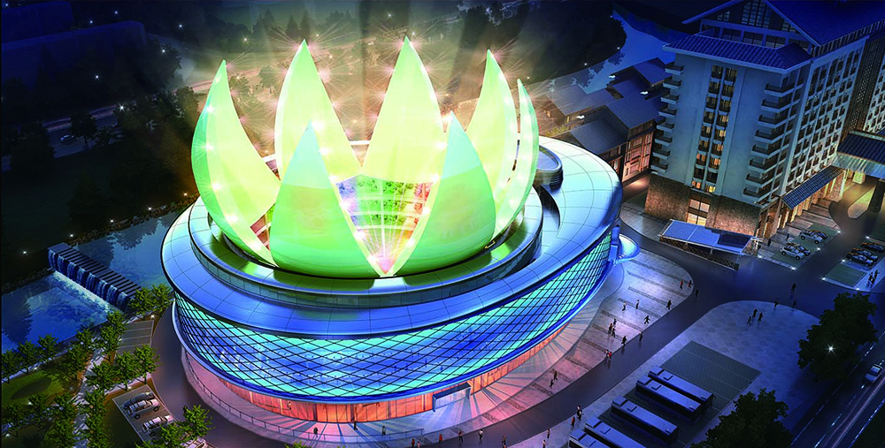 酒吧客容量為2000位,圓形布置,獨家設(shè)計研發(fā)的開合屋頂直徑達45米,均分10個花瓣緩慢打開