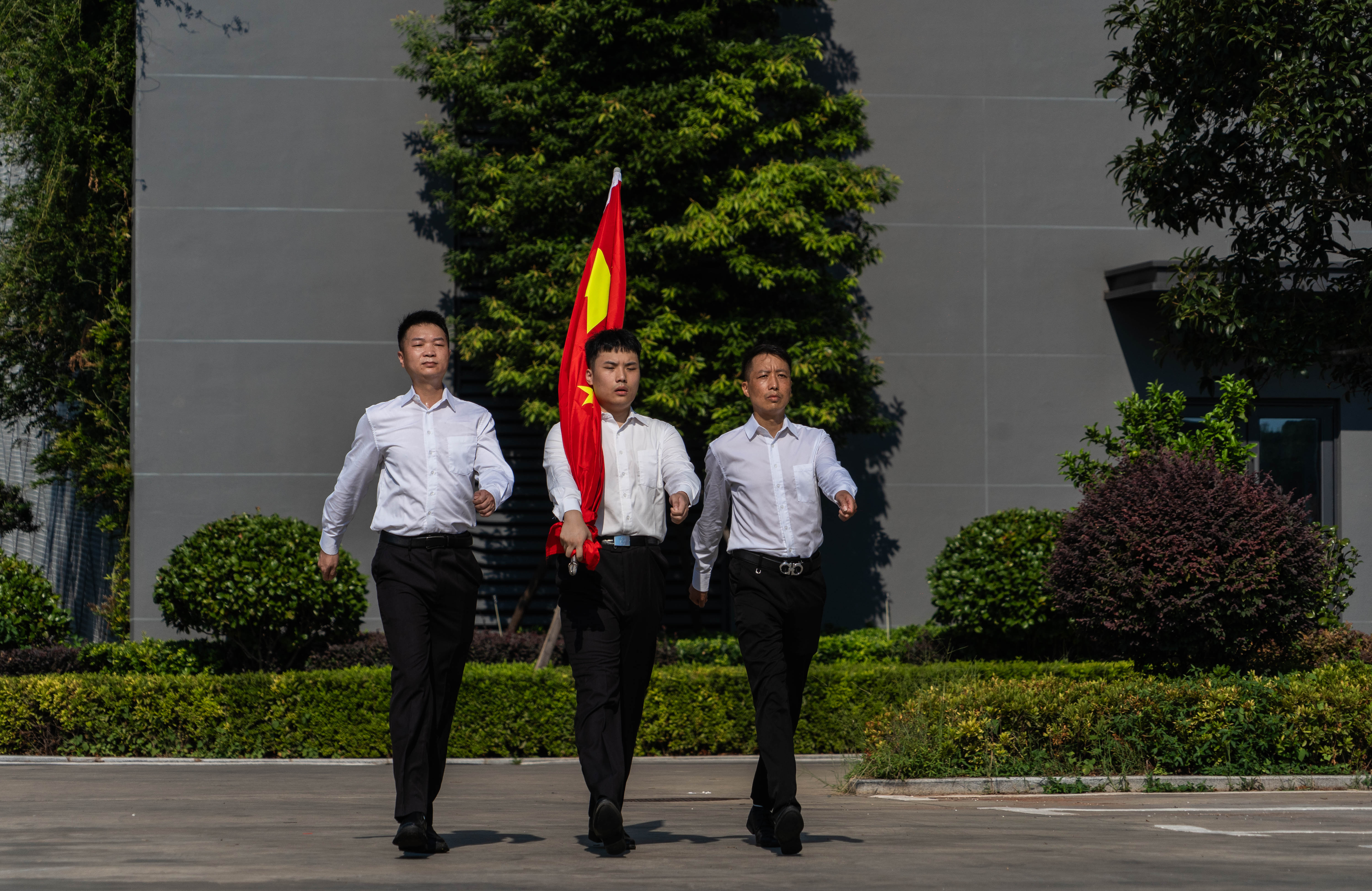活動(dòng)伊始,所有參與成員身著整齊工裝,身姿挺拔地列隊(duì)肅立。伴隨著莊嚴(yán)雄壯的國(guó)歌聲,3名護(hù)旗手昂首挺胸、闊步前進(jìn),邁著堅(jiān)實(shí)有力的步伐護(hù)送國(guó)旗行至升旗臺(tái)。在鏗鏘激昂的國(guó)歌聲中,鮮艷的五星紅旗在全體員工的注目下冉冉升起——那抹紅,是革命先烈用熱血浸染的顏色,是中華民族不屈精神的象征。