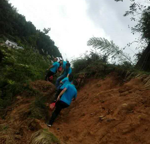 ▲去往該名同事家中的道路被泥石流沖毀,918博天堂“愛心支援服務隊”艱難跋涉,只為親手將溫暖與慰問送到該名同事的父母手中。