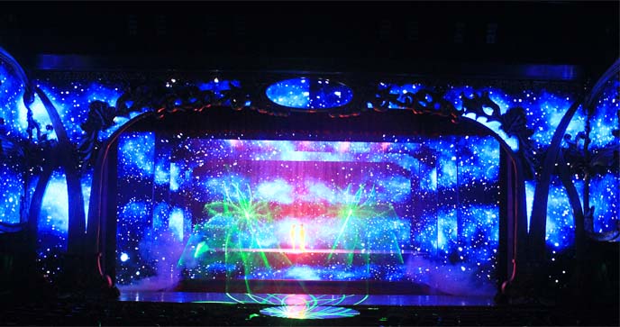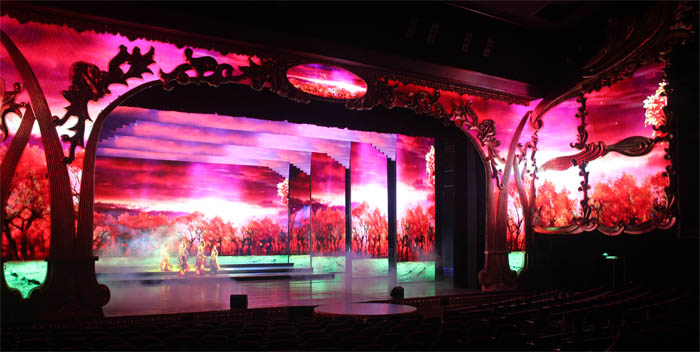 為打造出國際標(biāo)準(zhǔn)的大劇院,項目從LED屏前期設(shè)計上即考慮了與舞臺道具、表演的完美融合,最大程度實現(xiàn)了舞臺布景、演員道具與LED屏的完美融合。